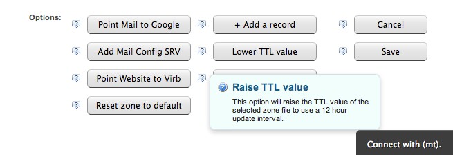 Aside from the regular options of Adding new DNS Records and resetting the DNS file to the original settings they also provide a helpful “Point Mail to Google” setting which I’ve used on a lot of my domains. The setting that I was after in this case was the “Raise TTL Value” (there is also a “Lower TTL Value” that comes in handy when moving sites). Unfortunately the standard TTL value for Media Temple is 21600 and the “Raise TTL Value” option will only increase this to 43200 (or 12 hours).
