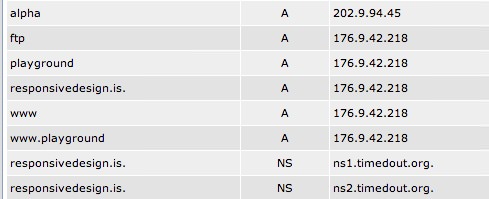 At this point I nearly bailed on Media Temple altogether, if they couldn’t provide a suitable DNS manager then why host there at all. After some deliberation I came to the conclusion that hosting somethings on media temple would help balance out a few things, plus it allowed me to continue to tinker with a dedicated server and keep my command line skills up to scratch. Another tipping point was that the alpha.responsivedesign.is site was being developed on a Matrix System that was hosted in the Squiz Cloud, so I would be pointing the DNS in a few different directions.
